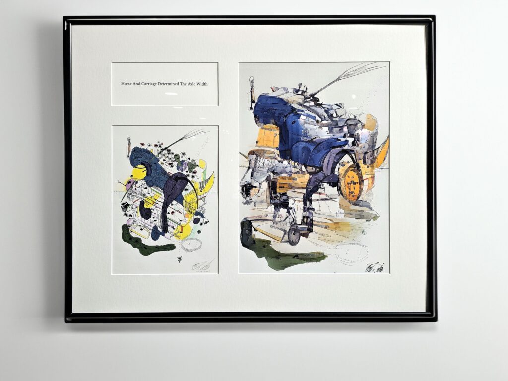 The Synthetic Evolution exhibition deconstructs and reinterprets existing hand-drawn works, using them as training sets for AI. This process allows the AI to further evolve and mutate these images, generating new iterations informed by additional key words inspired by the original drawings. These words act as guiding parameters, steering the AI’s algorithmic creativity and influencing the emergence of entirely new generative works derived from the original data